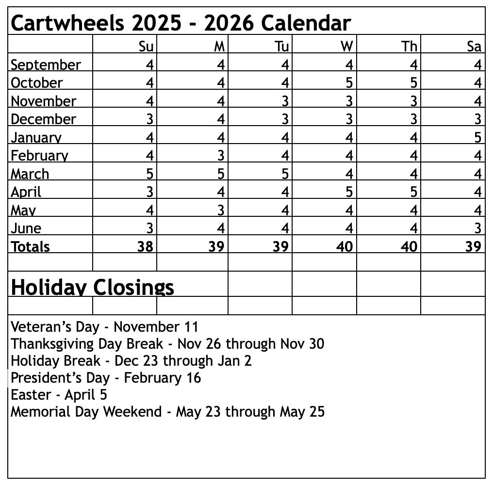 Cartwheels runs two sessions per year. Our school year session runs from September through June. Our monthly rate is based on getting 39 classes over the 10 month session month. Depending on the month you will get three, four, or five classes. Over the course of the 10 months it equals out that each day will get 39 or 40 classes.